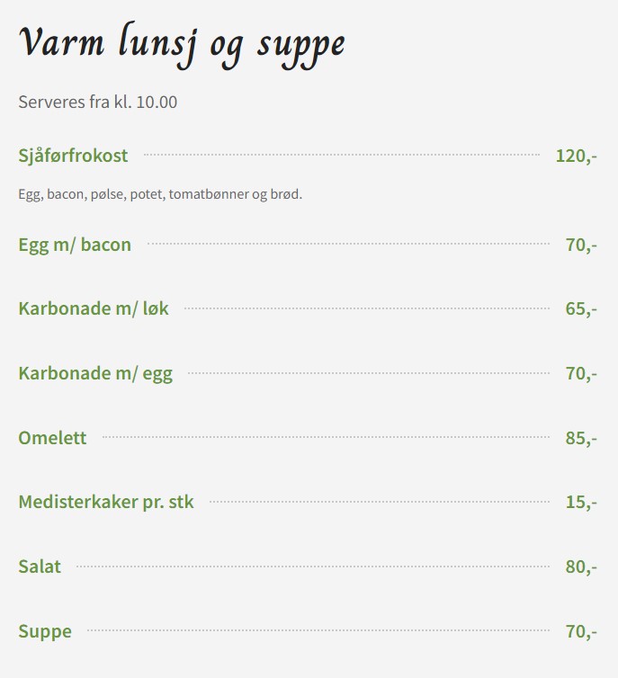 At Huset Kafè, the star of the menu is undeniably the authentic husmannskost, a style of food that embodies the essence of Norwegian comfort cuisine. The highlight dish is the Medisterkaker med tilbehør (meatballs with sides), generously plated at an incredible value of NOK 100. Each bite of these flavorful meatballs transports you to cozy family gatherings with their rich, savory taste. Don’t miss out on their Dagens suppe (soup of the day), perfect for warming your soul, and the delightful Dagens dessert, which adds a sweet closing note to your meal for only NOK 45. Every dish is crafted with the freshest ingredients, ensuring that every bite is an explosion of flavor.